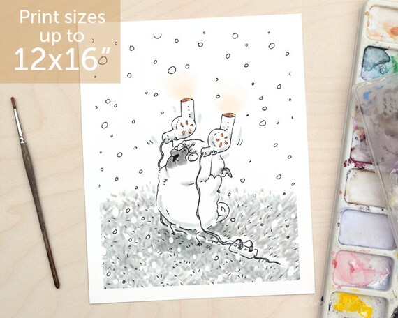 Kein Schnee Mops Kunstdruck - lustige Mops Kunst Schnee Mops mit Fön, Haar Trockner Mops, Winter Mops Zeichnung, Feder und Tinte Mops Illustration von